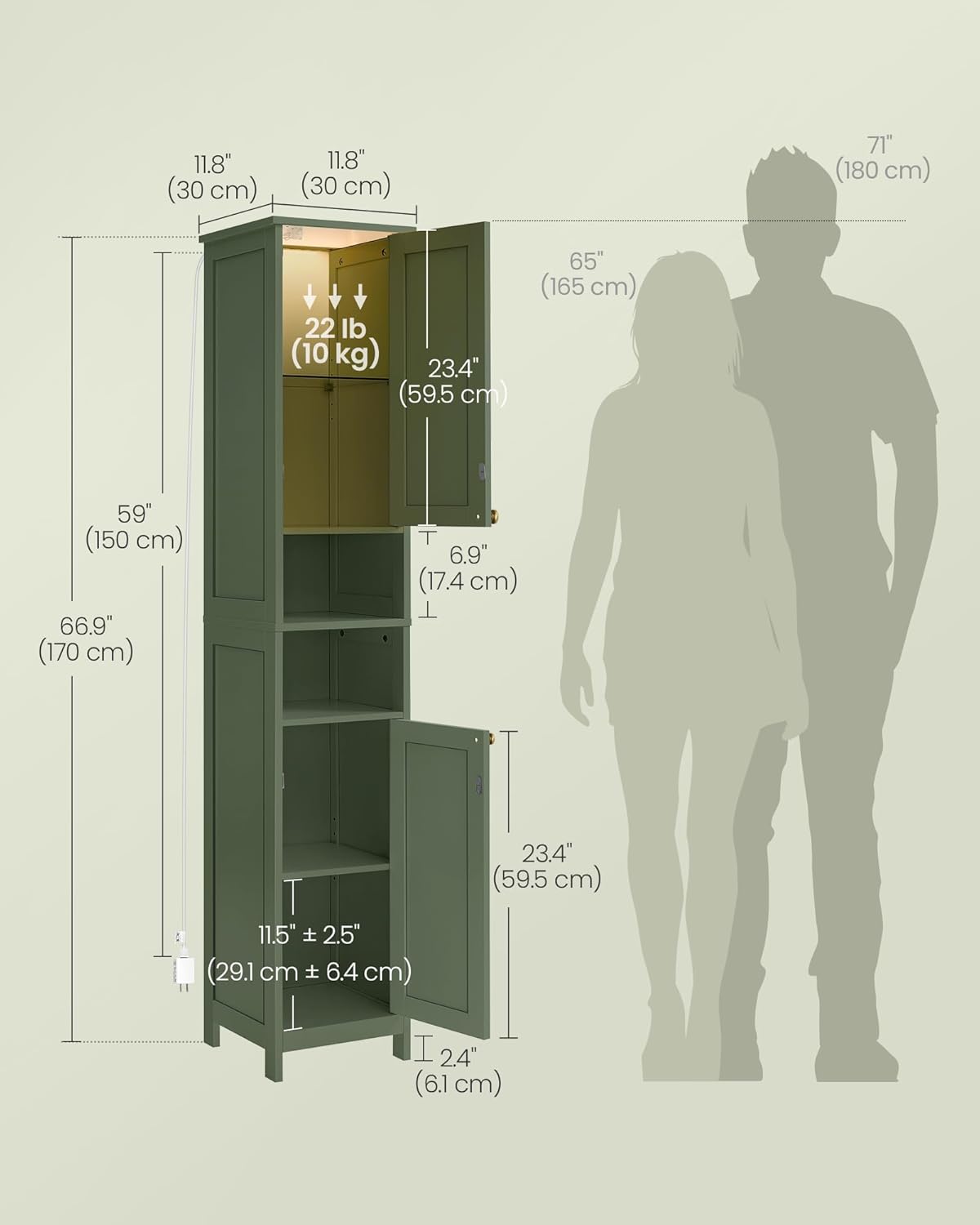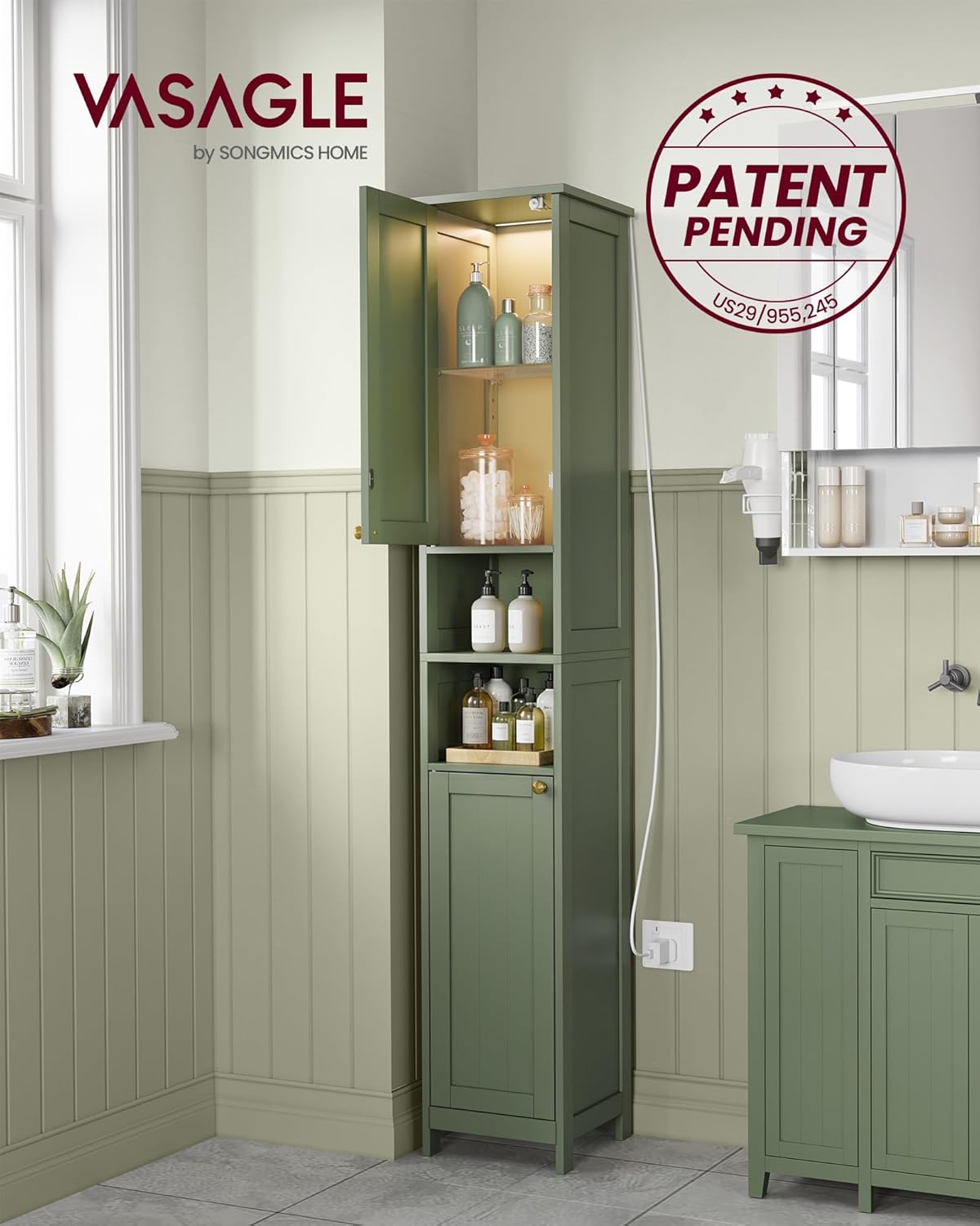 VASAGLE Tall Storage Cabinet with Lights, Slim Freestanding Cabinet with Adjustable Shelves, for Small Spaces, Bathroom, Living Room, Modern, 11.8 Inches Wide, Forest Green UBBC566C01