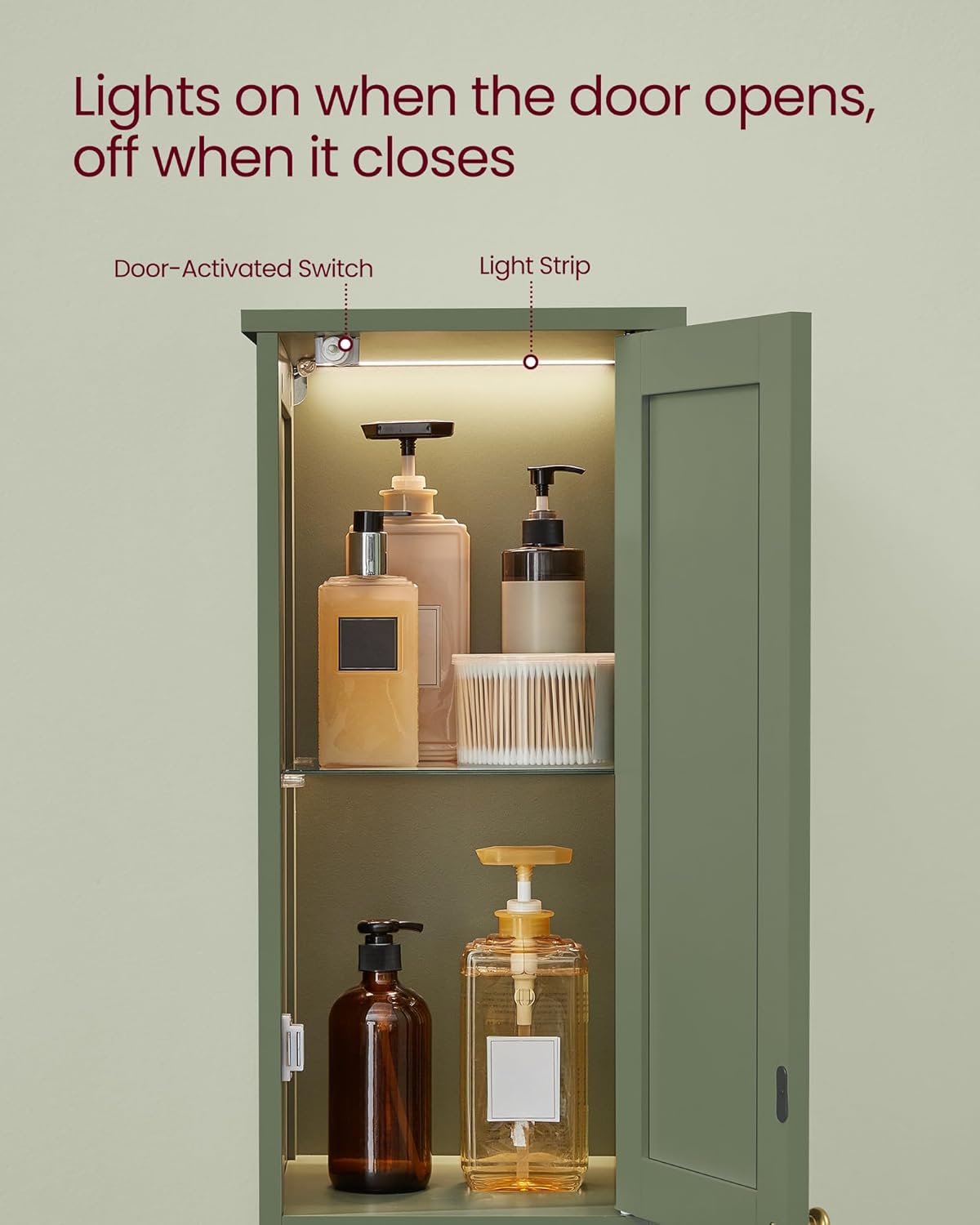 • Door-Activated Lights: This tall cabinet features a light strip that turns on automatically when the cabinet door is opened and off when it’s closed, making it easy for you to search for items in dim areas